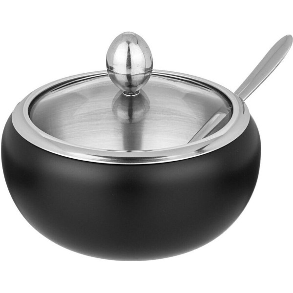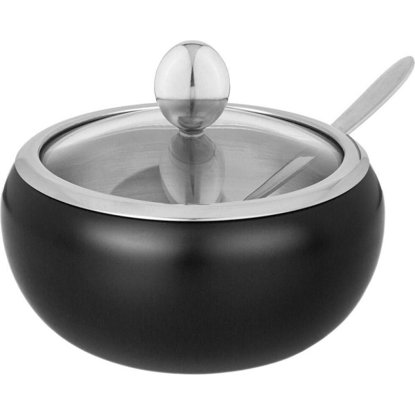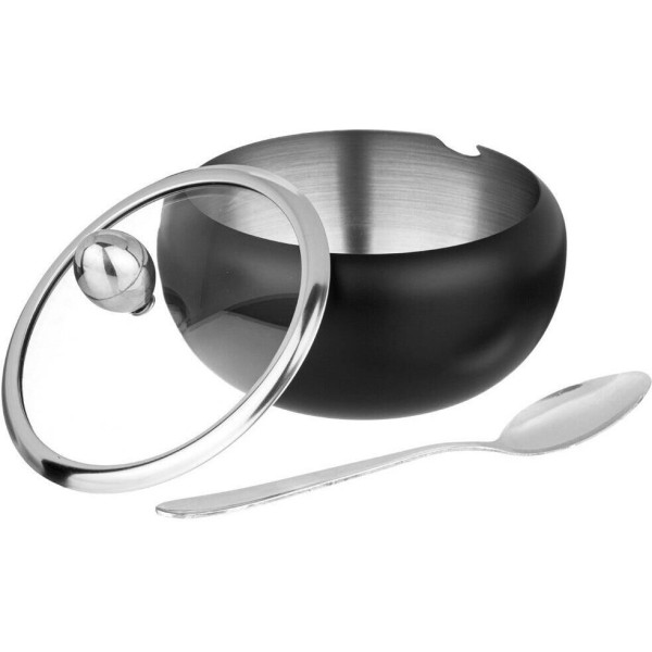 Сахарница выполнена из нержавеющей стали, имеет прозрачную крышку, сквозь которую видно количество содержимого, и ложечку для насыпания, которая располагается в выемке на корпусе сахарницы.