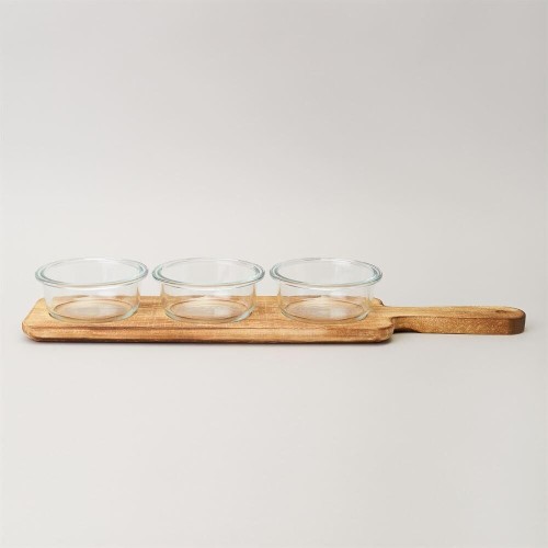 Изящный дизайн и высококачественные материалы делают эту менажницу незаменимой частью вашего стола. Прозрачное стекло позволяет продемонстрировать свежесть и разнообразие блюд, а натуральная деревянная подставка придает изделию изысканность и тепло.