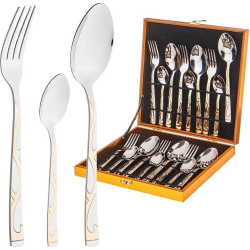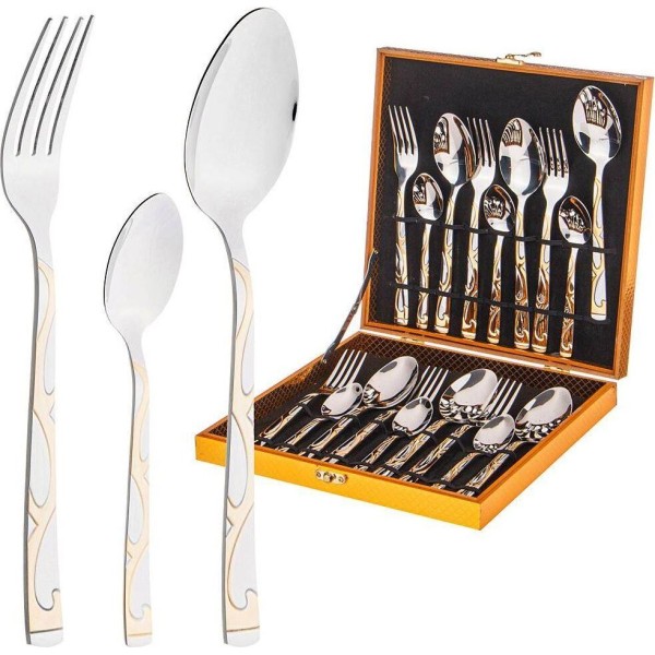Набор состоиз из 18пр. - 6 столовых ложек, 6 столовых вилок, 6 чайных ложек. Набор идет в подарочном деревянном кейсе, который также подойдет для дальнейшего хранения столовый приборов.