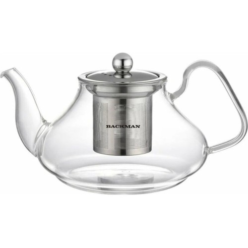 BACKMAN BM-0308 Чайник заварочный, 1000 мл, корпус из термостойкого боросиликатного стекла. Возможность использования на плите. Съемный фильтр и крышка из нержавеющей стали, не нагревающаяся ручка из стекла, подарочная упаковка.