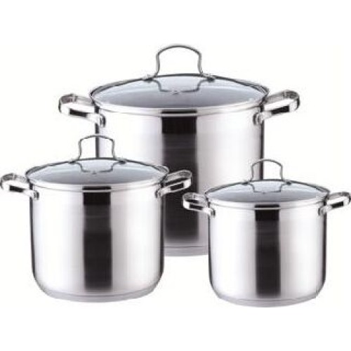 Наб.кастрюль-3 шт. - 2,1л, 3л и 4л. Внутри шкала измерения. Ручки не нагреваются. Высококач. нерж. сталь. 5-слойное капсульное дно. Зеркальная поверхность. Матовая полоска.; Можно использ-ть на всех типах плит + индукционную. Стекл. крышки с паровыпуском.