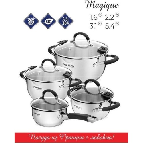 1525VS Набор 8пр Vensal Magique из 3 кастрюль 2,2л(18см), 3,1л(20см), 5,4л (24см), ковша 1,6л(16см) Материал изготовления высококачественная нержавеющая сталь AISI 304 с глянцевой полировкой. Толщина стенок 0,6 мм. Удобные отметки литража на внутренней поверхности посуды. Многослойное дно содержит алюминиевый слой, обеспечивающий равномерный и быстрый прогрев. Элегантные ручки из нержавеющей стали и силикона не скользят, удобны в уходе. Крышка с двумя видами отверстий и корпус с желобом для слива. Дно работает на всех известных типах плит, можно мыть в ПММ.