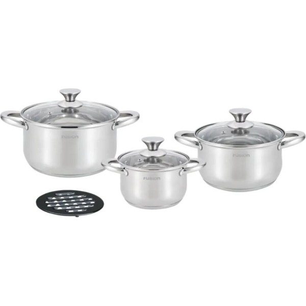 Набор посуды из 7 предметов для большой семьи: Кастрюля с крышкой 1,7 л, Кастрюля с крышкой 3,2 л, Кастрюля с крышкой 5,7 л, Подставка под горячее. Высококачественная нержавеющая сталь. Термораспределительное дно. Равномерный нагрев и удержание тепла Толщина капсулированного дна 4,5мм. Подходит для всех типов плит, в том числе для индукции. Крышка из закаленного стекла с отверстием для выпуска пара. Подставка под горячее в комплекте. Корпус цилиндрической формы. Удобные стальные ручки. Можно мыть в посудомоечной машине