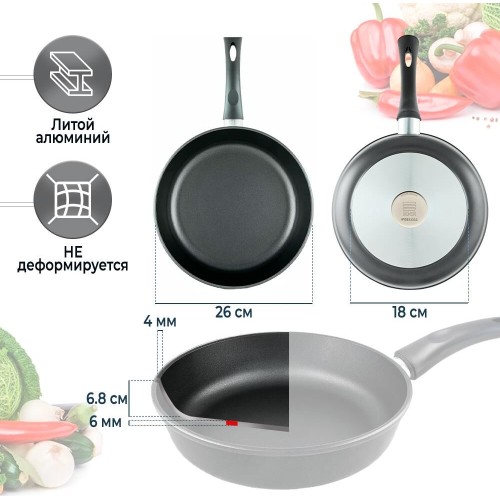 Тип универсальная сковорода Материал литой алюминий Форма круглая Наличие ручки 1 длинная Материал ручки бакелит Габариты Общий диаметр 26 см Диаметр дна 18 см Толщина дна 6 мм Толщина стенок 4 мм Высота 6.8 см Покрытие и дно Антипригарное покрытие Возможность мыть в посудомоечной машине
