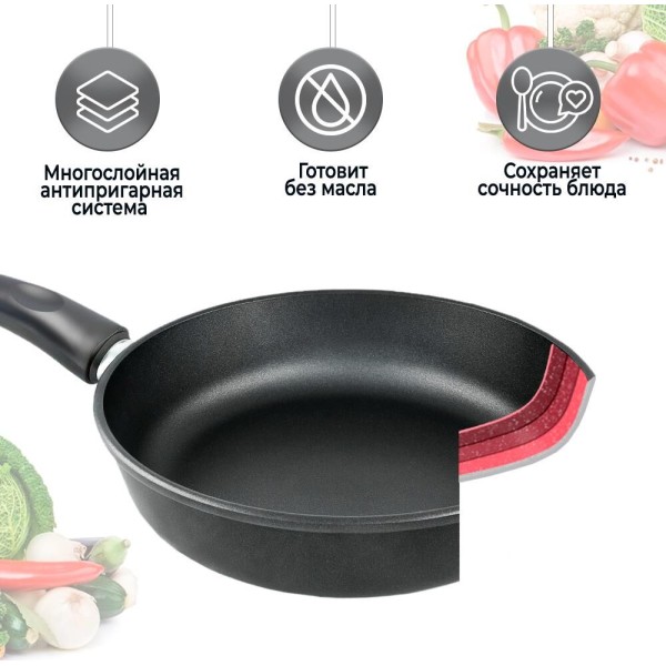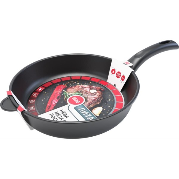 Общий диаметр 28 см Диаметр дна 22 см Толщина дна 6 мм Толщина стенок 4 мм Высота 7 см Тип универсальная сковорода Материал литой алюминий Форма круглая Наличие ручки 1 основная и дополнительная Материал ручки бакелит Покрытие и дно Антипригарное покрытие Особенности использования Возможность мыть в посудомоечной машине