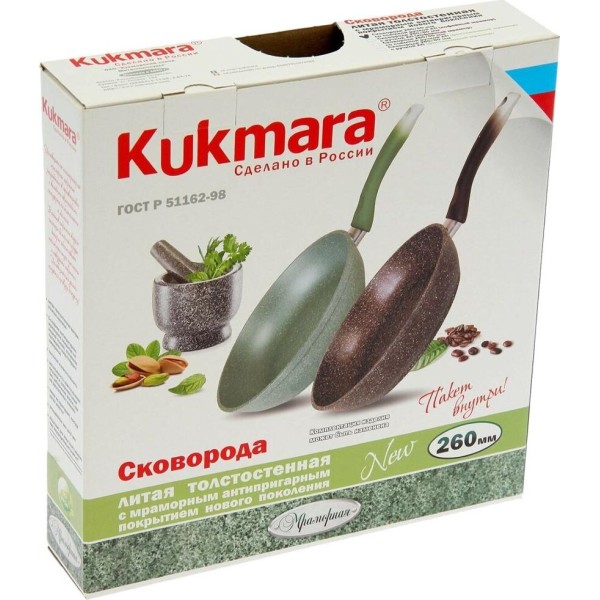Объем, л./размер, см: 26см Материал: литой алюминий Коллекция/серия: Мрамор Торговая марка: Kukmara Толщина дна: 6 Толщина стенок: 4.5 Источник тепла: Все виды плит, кроме индукционной Тип упаковки: цветная коробка Внутреннее покрытие: антипригарное покрытие Greblon C2 фирмы Weilburger Coatings GmbH Внешнее покрытие: декоративное покрытие Poli Decor, Кирово-Чепецк