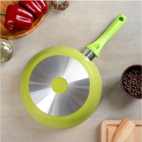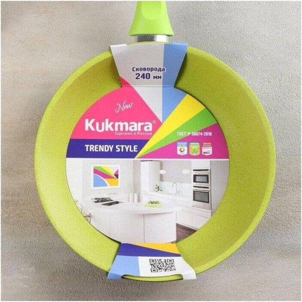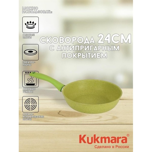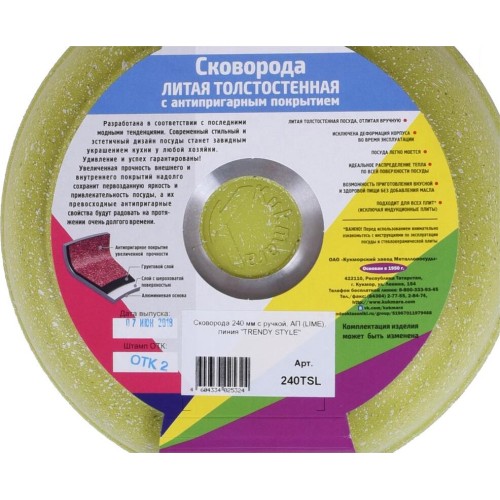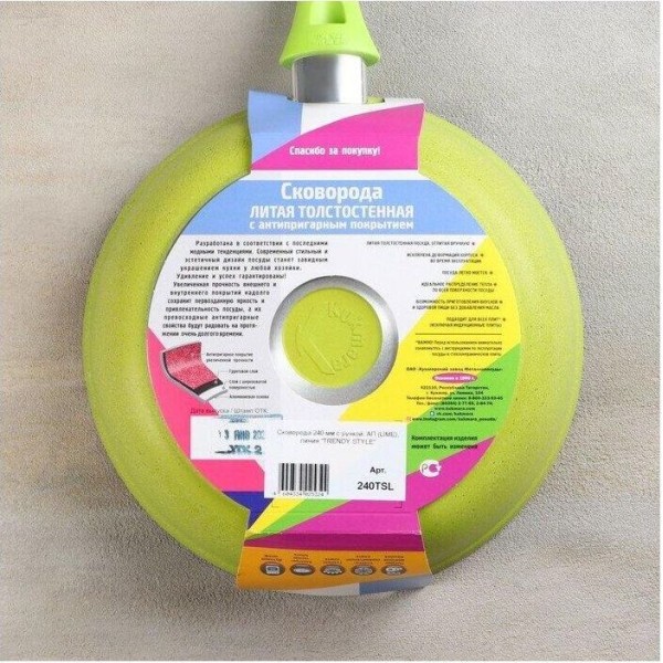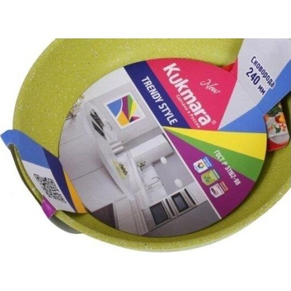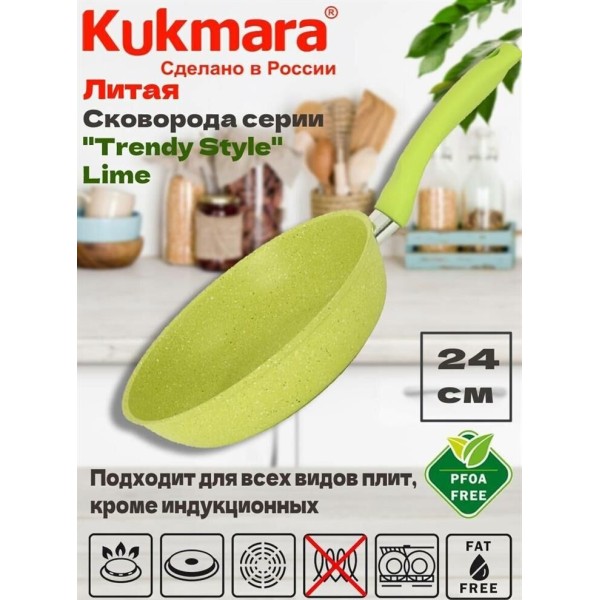 Сковорода а/пр литая 24см Trendy style lime ТМ KUKMARA, изготовлена из литого алюминия толщина стенки- 4,5мм; Толщина дна- 6 мм. Подходит для всех типов плит, кроме индукционных. Можно мыть в посудомоечной машине. Произведено в РОССИИ.