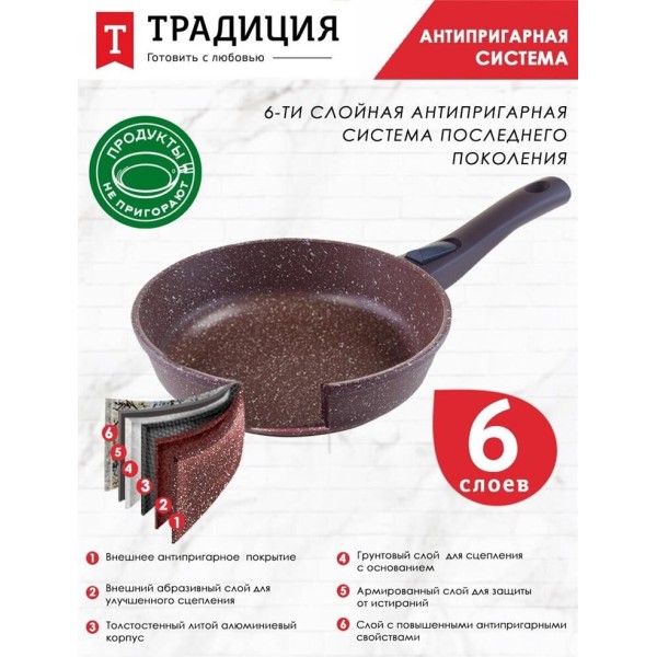 кроме индукционной. Изготовлена по ГОСТ Р51162-98. Не содержит перфтороктановую кислоту, материал ручки бакелит. Многослойное дно. Антипригарное покрытие Greblon NewTec C2+. Изделие совместимо со всеми видами плит