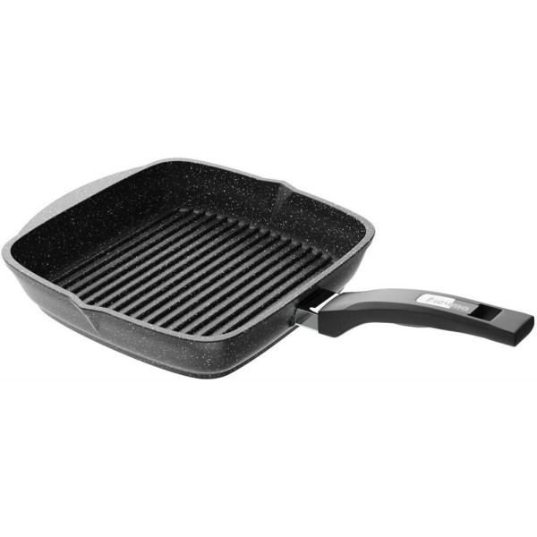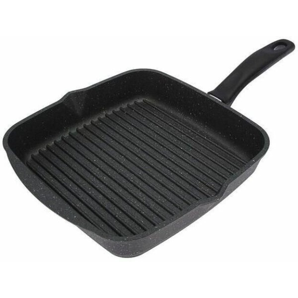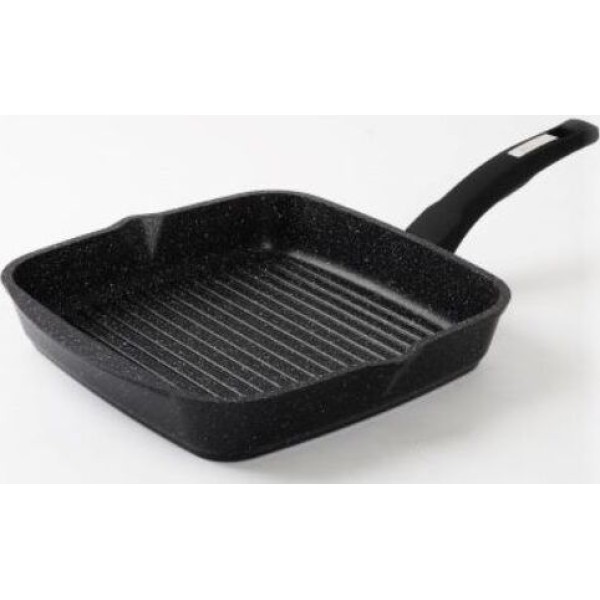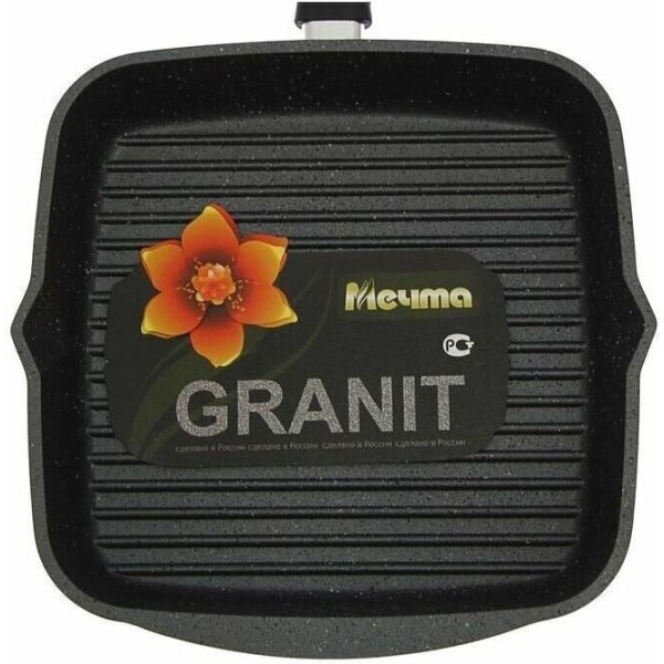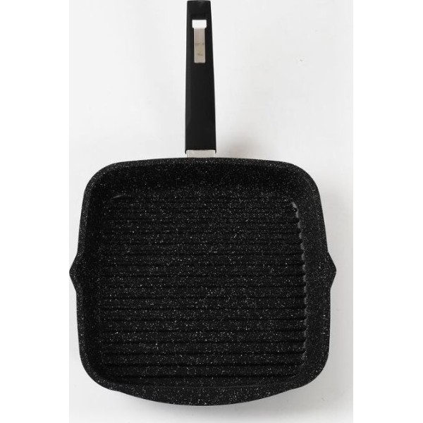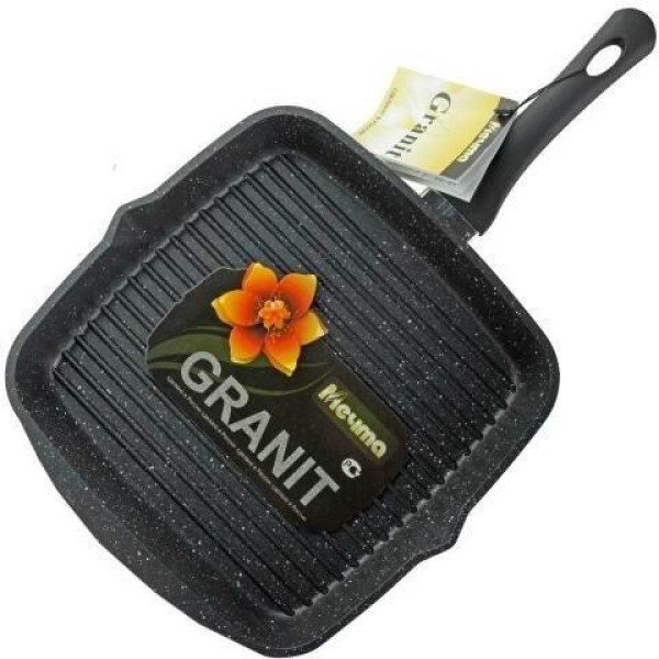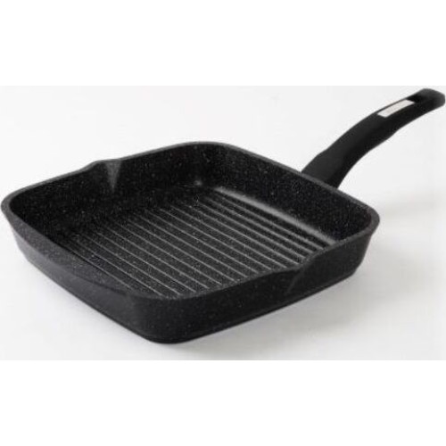 Сковорода-гриль квадр. 26*26 см с антипригарным покрытием и несъемной ручкой серии "Гранит black". Подходит для всех типов плит, кроме индукционных. Можно использовать в посудомоечной машине.