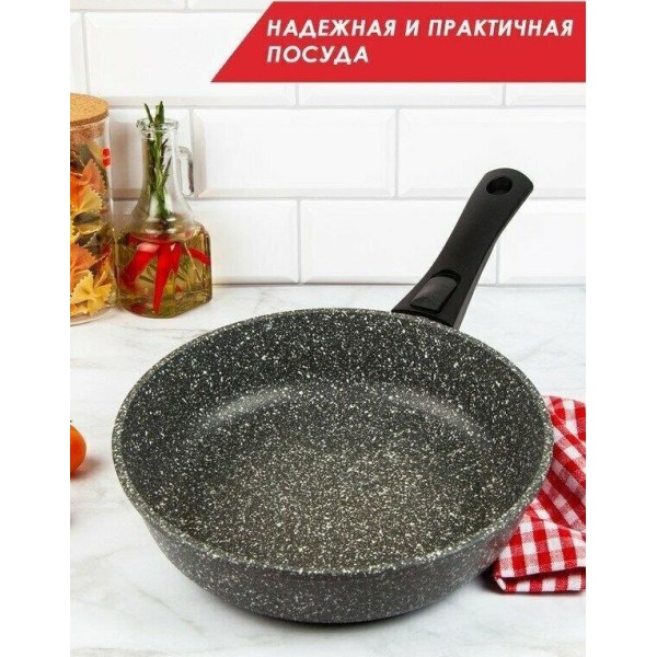 Сковорода 24 см Мрамор. Материал: пищевой литой алюминий. Антипригарное мраморное покрытие. Подходит для всех тип плит, в том числе индукционных. Имеет съемную ручку, легко чистится. Можно мыть в посудомоечной машине. Без крышки.