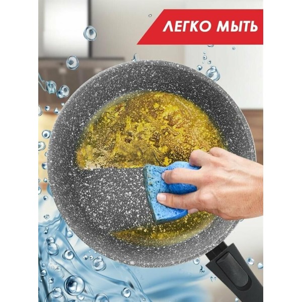 Сковорода 26 см Мрамор. Материал: пищевой литой алюминий. Антипригарное мраморное покрытие. Подходит для всех тип плит, в том числе индукционных. Имеет съемную ручку, легко чистится. Можно мыть в посудомоечной машине. Без крышки.