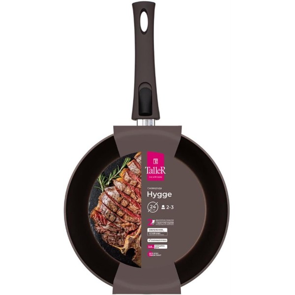 Сковорода Hygge, 24 см, с бакелитовой съемной ручкой. Материал: кованый алюминий, толщина дна 3,8 мм, толщина стенок 3,3 мм Высота 4,8 см внешний диаметр дна – 19.4 см Подходит для всех типов плит, включая индукционную. Рекомендовано ручное мытьё. Упаков