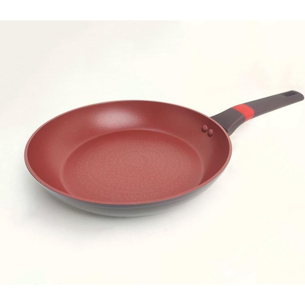 Сковорода из кованного алюминия с антипригарным покрытием и индукционным дном. Толщина 2,4 мм. Эргономичная бакелитовая ручка с покрытием soft-touch с красной силиконовой вставкой. Имеет внутреннее антипригарное покрытие красного цвета. На дне сковороды находится рисунок, который при нагревании проявляется. Подходит для всех видов плит. Можно мыть в посудомоечной машине. Диаметр 26 см.