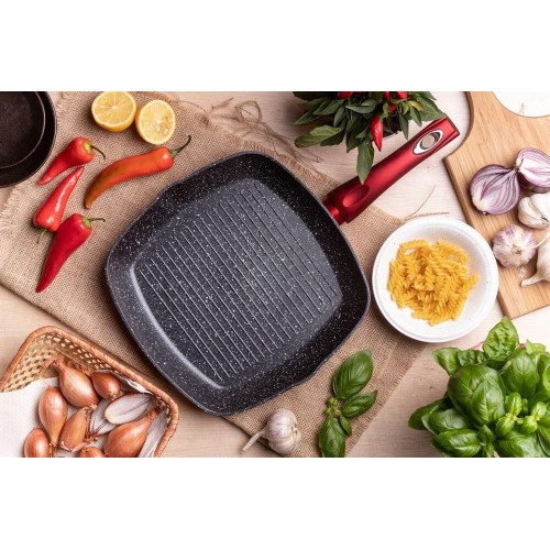 Гриль-сковорода. Современный эргономичный дизайн, литой алюминий. Высококачественный литой алюминий, внутреннее мраморное покрытие. Красный цвет металлик снаружи, ненагревающаяся ручка. Простота и удобство в использовании и уходе. Подходит для всех видов плит, в том числе и для индукционных плит. Можно мыть в посудомоечной машине.