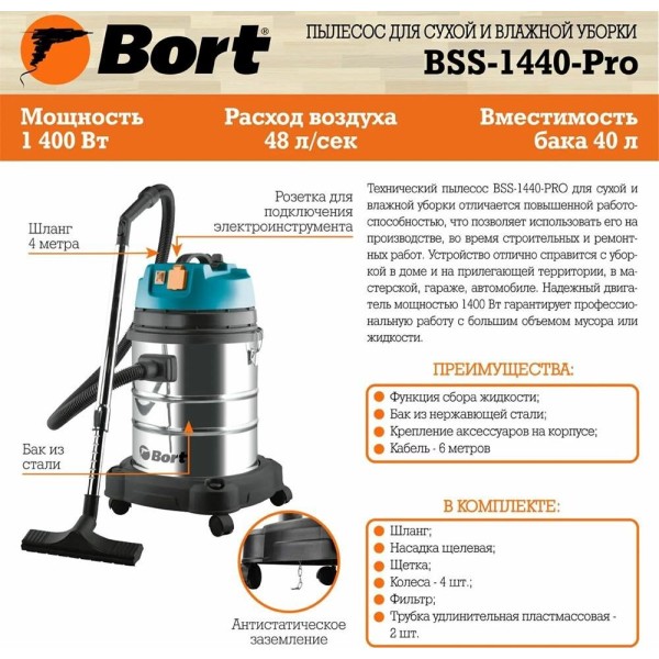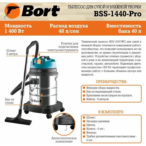 Расход воздуха 38л/сек; пылесборник 40л; Потреб мощность 1 400Вт; Разрежение 19кПа; Сухая/влажная уборка; шланг 4м; Диаметр шланга 35мм; Мощность всасывания 280Вт; Регулировка силы всасывания; Подключение электроинструмента; Функция автоотключения; Функция сбора жидкости; кабель 4,5м; Уровень шума 74дБ; Вес 10кг; Напряжение 220-240В; Частота тока 50Гц