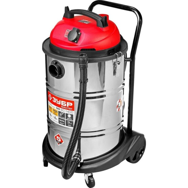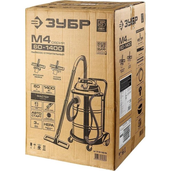Пылесос ЗУБР "МАСТЕР" строительный, модель М3-60, 60л, 1400Вт, сухая и влажная уборка, корпус из нержавеющей стали, розетка до 2000Вт ПУ-60-1400 М4. Строительный пылесос ЗУБР предназначен для уборки помещений, а также для принудительного удаления продуктов пиления, строгания, фрезерования и т.п. из рабочей зоны электроинструмента. Он незаменим для поддержания чистоты в гараже, мастерской, удаления мусора во время ремонта в квартире или на даче. Бак из нержавеющей стали объемом 60 л очень долговечен. а синхронное включение с инструментом, подключенным через розетку пылесоса позволит сохранить чистоту на рабочем месте.