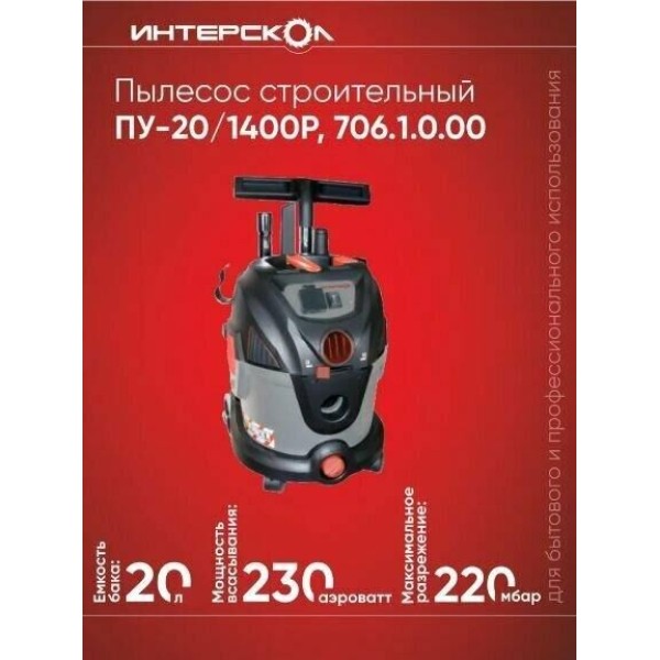 Строительный пылесос ИНТЕРСКОЛ ПУ-20/1400Р 706.1.0.00