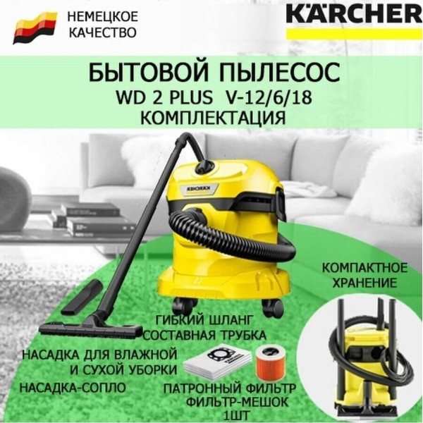 Бренд KARCHER Модель WD 2 Plus V-12/6/18/C Тип уборки сухая/влажная Мощность 1000 Вт Тип пылесборника мешок/контейнер Объем пылесборника 12 л Возможность работы без мешка есть Регулировка мощности нет Особенности Функция выдува есть Розетка для электроинструмента нет Количество насадок в комплекте 3 Насадки щелевая насадка, насадка для сухой и влажной уборки. Мягкая накладка на рукоятке нет Тип питания от сети Длина сетевого шнура 6 м Длина всасывающего шланга 1.8 м Диаметр всасывающего шланга 35 мм Материал шланга пластик Материал трубки пластик Материал корпуса пластик Размеры и вес Цвет желтый Ширина товара 32.8 см Высота товара 37.8 см Длина товара 34.9 см Вес товара 4.3 кг Габариты упаковки (ед) ДхШхВ 0.4x0.38x0.4 м Вес упаковки (ед) 8.2 кг