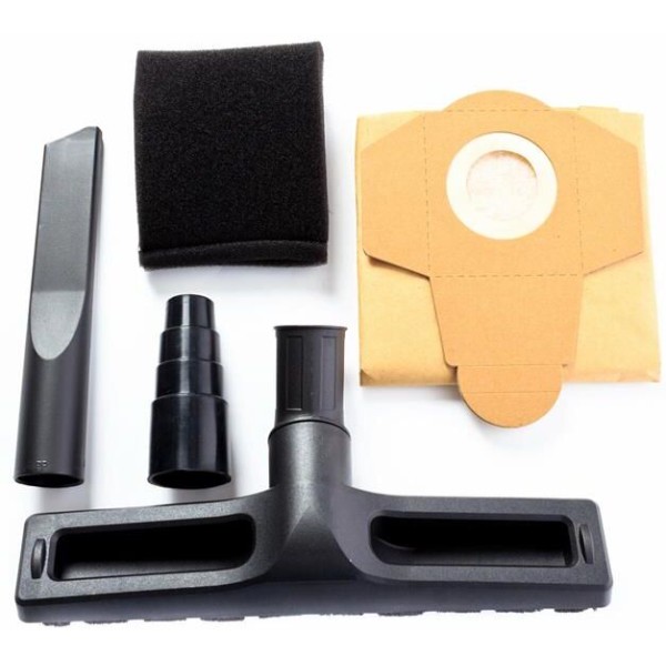 Гибкий воздушный шланг, Для уборки пола, Бумажный мешок, Адаптер для пылесоса, щелевая насадка, насадка для пола, Фильтр из вспенённого полимера, Инструкция, Соединительные трубки - 2шт, Упаковка, Фильтр HEPA, Транспортировочные колёса - 4шт