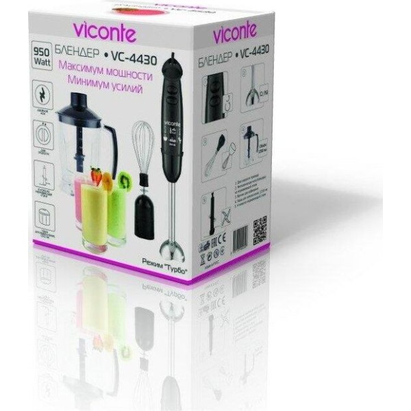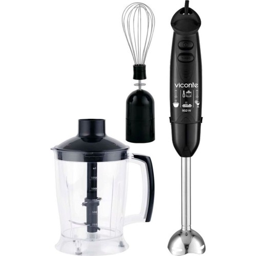 Погружной блендер, мощность 950W, пульсовый режим работы, 2 скорости, металлическая нога блендера, венчик для взбивания, чаша объемом 1250 мл с ножом из 4 лезвий для рубки и измельчения, автоматическая блокировка при неправильно установленной насадке.