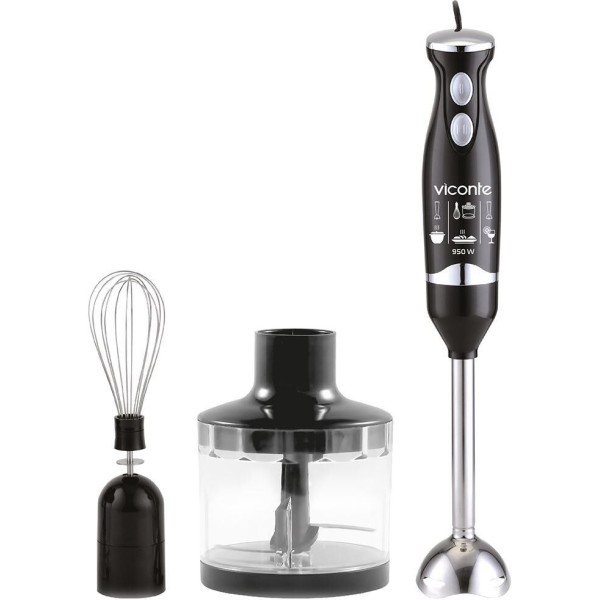 Погружной блендер Viconte VC-4446 950 W, Погружной блендер, мощность 950 W, современный эргономичный дизайн, пульсовый режим работы, 2 скорости, лезвия из нержавеющей стали, металлическая нога блендера, венчик для взбивания, чаша с ножом для рубки и измельчения, 500 мл; автоматическая блокировка при неправильно установленной насадке, удобство и простота в обращении и чистке.