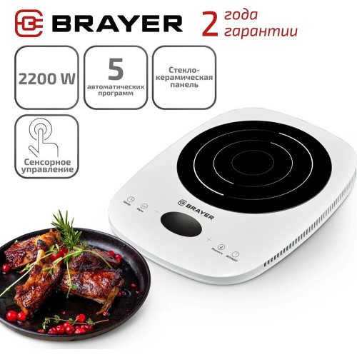 Максимальная мощность 2000 Вт 1 конфорка 19 cm. 5 автоматических программ работы Стеклокерамическая панель Сенсорное управление Выбор температуры (80-270С) Таймер до 3 ч. Автоотключение при отсутствии посуды Блокировка при перегреве