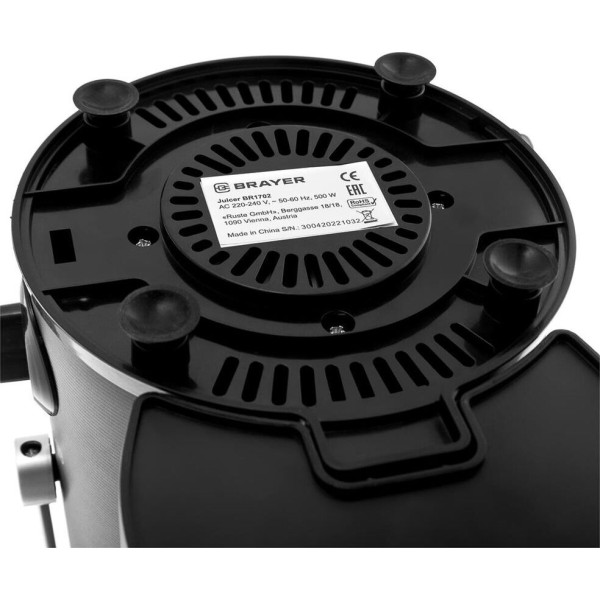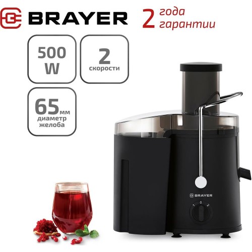 Центробежная соковыжималка Мощность 500 Вт 2 скорости Корпус из высококачественного пластика Контейнер для сока объемом 0,5 л Контейнер для мякоти объемом 1,6 л Диаметр отверстия 65 мм Противокапельная система Прорезиненные ножки