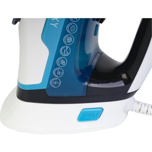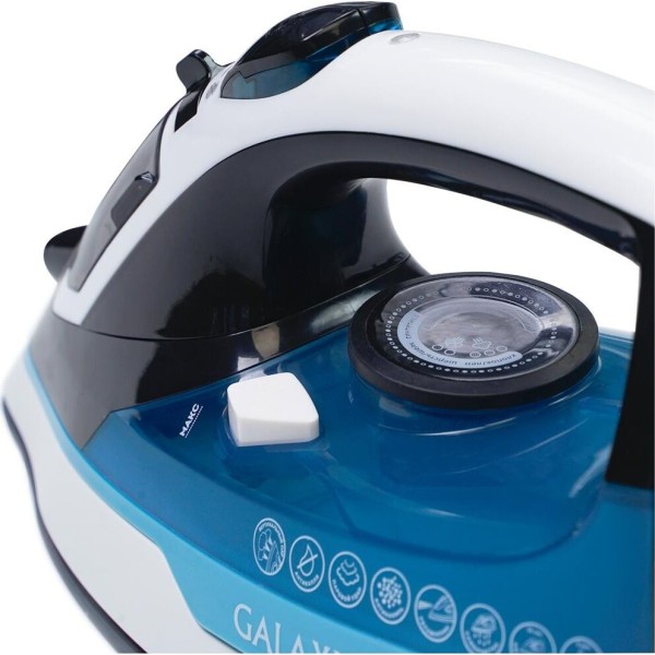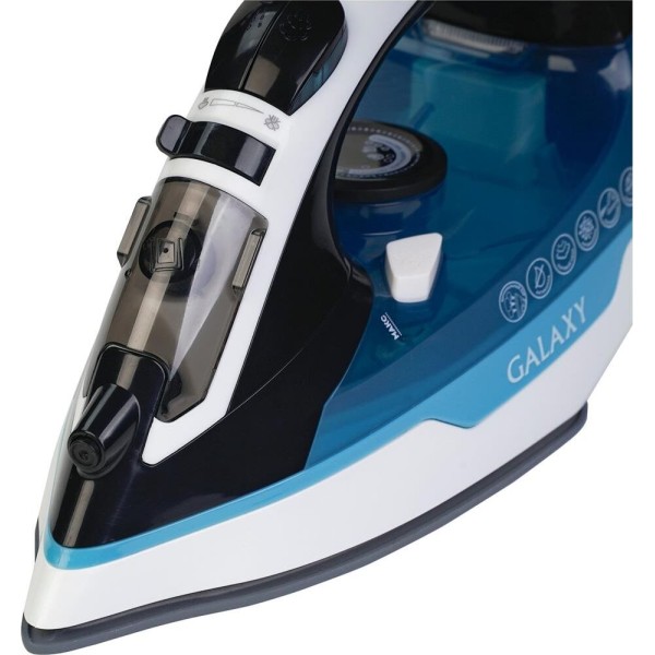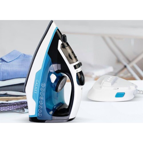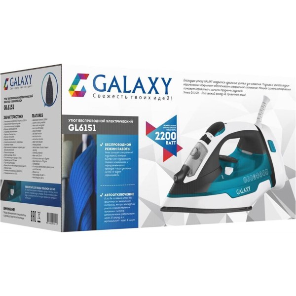 GALAXY GL 6151 Мощность: 2200 Вт Керамическое покрытие подошвы Уплотнитель крышки резервуара Функция "Автоотключение" Индикатор автоотключения Функция “Самоочистка” Функция “Антикапля” Функция “Антинакипь” Указатель максимального уровня воды Индикатор нагрева Вертикальное отпаривание / паровой удар / функция увлажнения Защита от перегрева Емкость для воды: 320 мл Постоянная подача пара: 45 г/мин "Паровой удар": до 170 г/мин Компактная подставка для зарядки Время работы в беспроводном режиме: до 60 с Использование в режиме отпаривания: до 30 c Длина шнура питания: 1,9 м Мерный стакан Питание: 220-240 В ~ 50 Гц