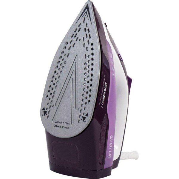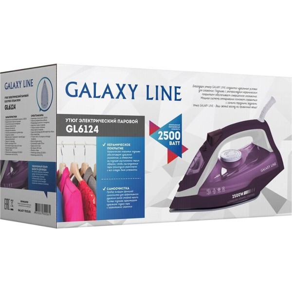 GALAXY LINE GL 6124 Мощность, Вт: 2500 Керамическое покрытие подошвы Уплотнитель крышки резервуара Функция «Самоочистка» Функция "Антикапля" Функция "Антинакипь" Указатель максимального уровня воды Индикатор нагрева Вертикальное отпаривание Паровой удар Функция увлажнения Защита от перегрева Емкость для воды 370 мл. Постоянная подача пара до 50 г/мин Паровой удар до 230 г/мин Мерный стакан Напряжение сети, В: 220-240 Частота, Гц: 50