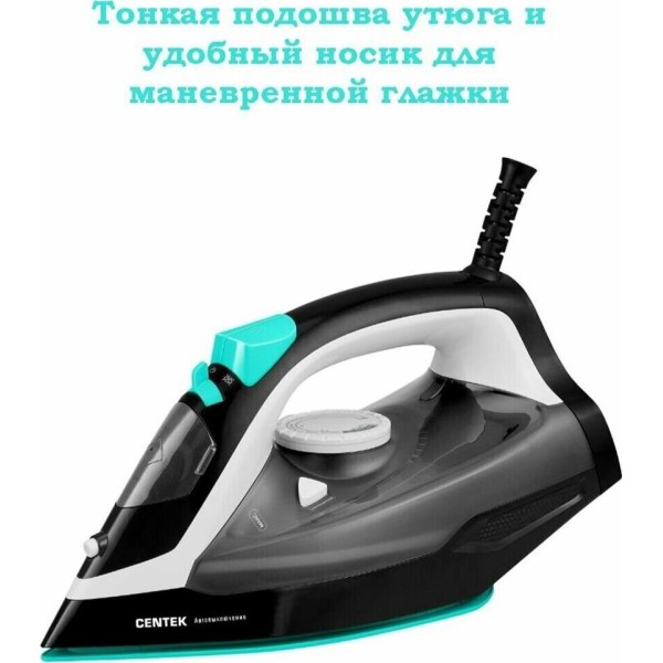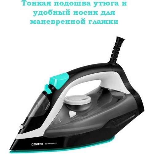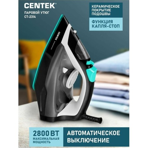 Утюг Centek CT-2314 обеспечивает простое и эффективное глажение: большое количество пара разглаживает жесткие складки, подошва с керамическим покрытием превосходно скользит на любых тканях, а функция очистки от накипи повышает надежность прибора. Кабель д