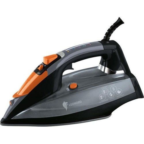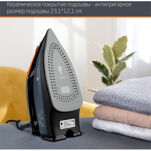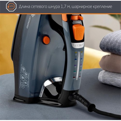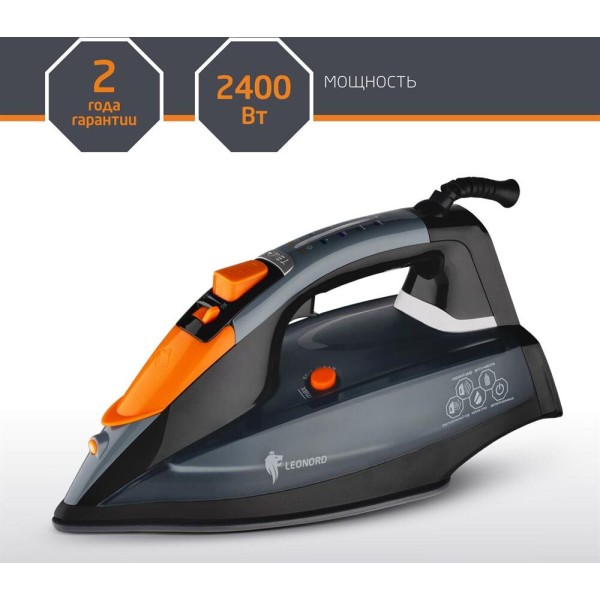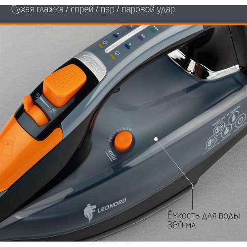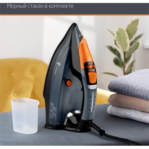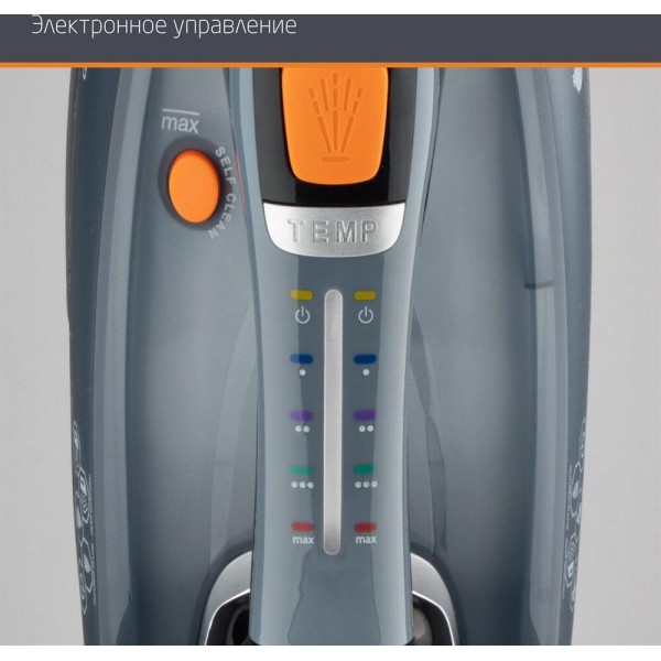 Электронное управление Мощность 2400Вт Подошва с керамическим покрытием Сухая глажка/спрей/пар/паровой удар/вертикальное отпаривание Индикатор нагрева Функция автоотключение Функция самоочистки Функця "капля стоп" Функция защиты от накипи Объем резервуара для воды 380 мл Паровой удар 0,5 г/удар Подача пара 20г/мин Регулировка подачи пара Шарнирное крепление шнура Длина сетевого шнура 1,7м Размер подошвы 23,1*12,1см Зауженный носик Мерный стакан в комплекте Защита от перегрева
