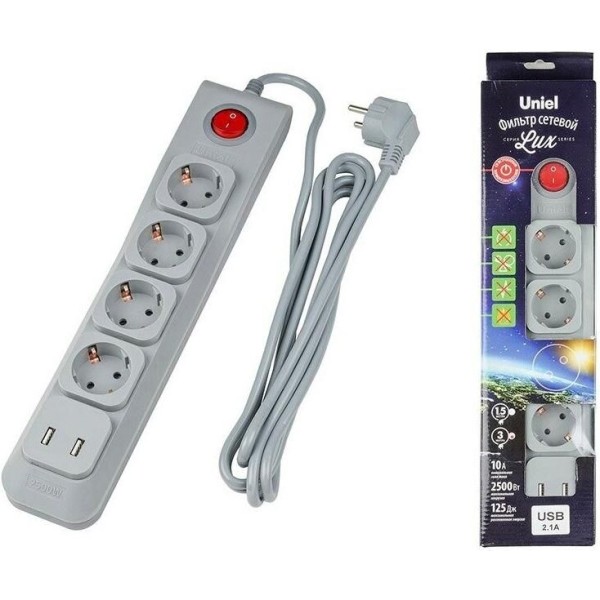 Cетевой фильтр серии Lux, 3м (ПВС 3*0,75), 4 гнезда, с/з, 1USB(1A). 10А. Защита от перенапряжения, короткого замыкания. Длина кабеля, м - 3; Заземление - Да; Защита от перегрузки - Да; Количество USB-портов, шт. - 1; Количество гнезд, шт. - 5; Максимальная нагрузка, Вт - 2 500; Материал корпуса (изделия) - пластик негорючий; Минимальная партия - 1; Наличие USB-порта - Да; Наличие выключателя - Да; Наличие заглушек - Да; Номинальная сила тока, А - 10; Сечение провода, мм2 - 0,75; Срок гарантии, мес. - 12 месяцев; Страна производства - Китай; Цвет корпуса (изделия) - серый