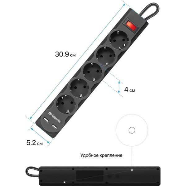 Номинальное напряжение/частота: 230 В / 50 Гц, Максимальная суммарная мощность нагрузки: 2200 Вт, Максимальный ток нагрузки: 10 А, Максимальная рассеиваемая энергия: 220 Дж, Защищаемые цепи: Фаза-ноль, Защита от перегрузки и короткого замыкания: Автоматический несгораемый предохранитель, встроенный в выключатель, Кол-во USB-портов для зарядки: 2 шт., Розетки с заземлением: 5 шт., Напряжение на USB-портах: 5 В, Токовая защита USB-портов, USB-порт для зарядки устройств, Максимальный ток USB-порта: 2.1А, Длина: 5м, Крепление на стену.