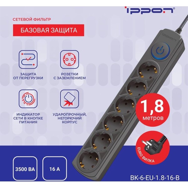 IPPON Сетевой фильтр BK-6-EU-1.8-16-B 1.8м (6 розеток) черный (коробка)