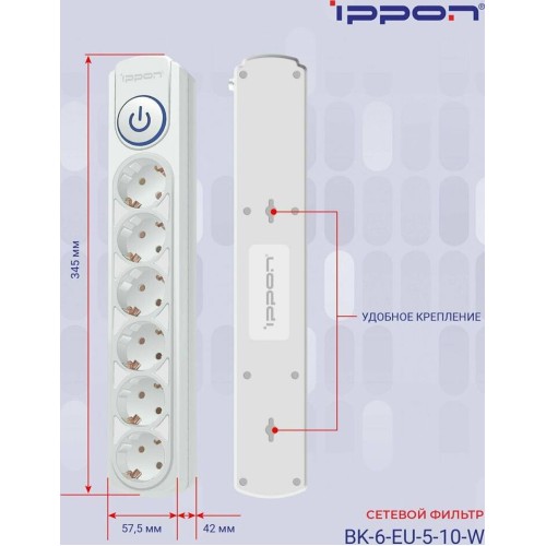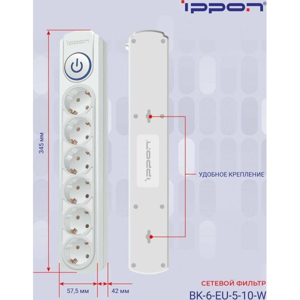 IPPON Сетевой фильтр BK-6-EU-5-10-W 5м (6 розеток) белый (коробка)