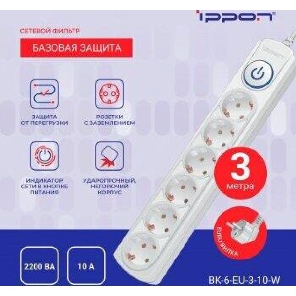IPPON Сетевой фильтр BK-6-EU-3-10-W, 3м, белый