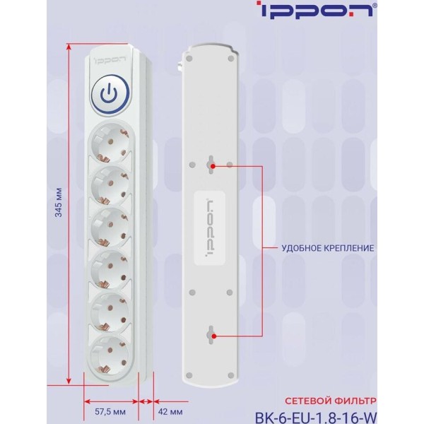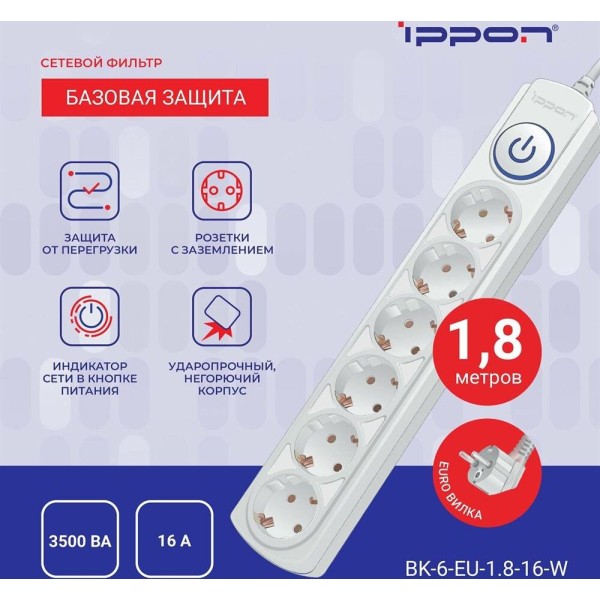 IPPON Сетевой фильтр BK-6-EU-1.8-16-W, 1.8м, белый