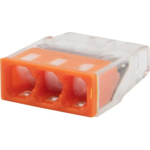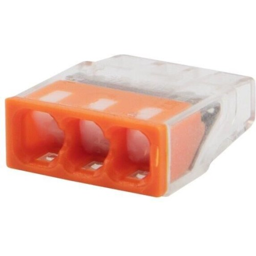 Строительно-монтажные экспресс-клеммы REXANT предназначены для подсоединения медных одножильных проводников. Они являются одним из самых быстрых, надежных и удобных способов монтажа проводников в условиях нехватки и ограничения площади. Обеспечивают экономию места до 50% по сравнению с простыми пружинными клеммами. Компактный прозрачный корпус удобен для контроля соединения, а яркая цветовая разметка способствует визуальному различию клемм по количеству проводников. Экспресс-клеммы одновременно подходят для медных и алюминиевых проводников. Прочный корпус из высококачественных материалов не поддерживает горение. Технические характеристики: Материал корпуса: полиамид 66 Контакты: луженая медь Количество контактов: 3 Цвет: прозрачный Напряжение: 450 В Ток: 24 А Поддерживаемое сечение: 3x0,2-2,5 мм² (одножильный провод) Длина зачистки изоляции: 11 мм Рабочая температура: –40...+85 °С