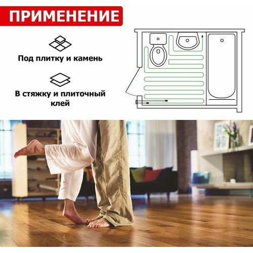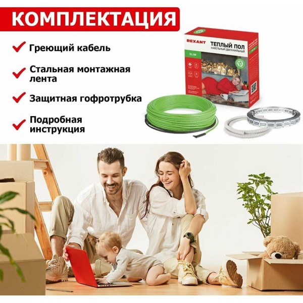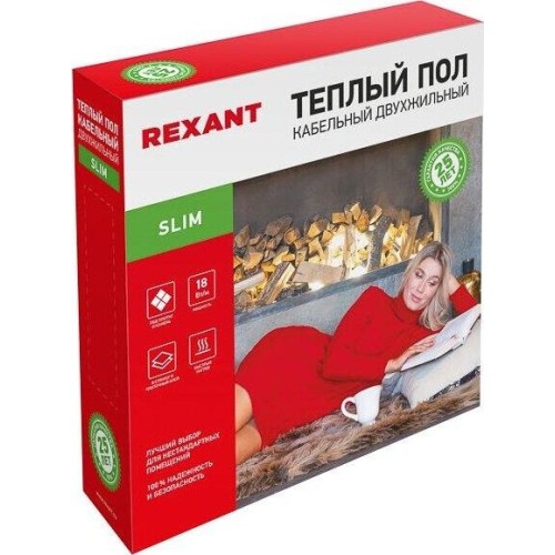 В комплектах REXANT Slim используется тонкий кабель с удельным тепловыделением 18 Вт/пог.м. Данный кабель используется для создания теплых полов и укладывается прямо под напольное покрытие, не требуя заливки в бетонную стяжку. Комплекты рассчитаны на работу от бытовой электросети соответствующей мощности с напряжением 220-240 вольт. Номинальная мощность и длина нагревательного кабеля указана на упаковке.