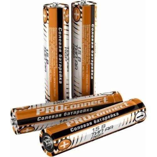 Солевые батарейки предназначены для работы в устройствах с низким и средним потреблением тока. Характеристики: Тип батареи: Zinc Carbon, Размер: АА, Номинальное напряжение: 1,5 В, Солевые батарейки PROconnect это надежные, доступные источники питания с длительным сроком службы.