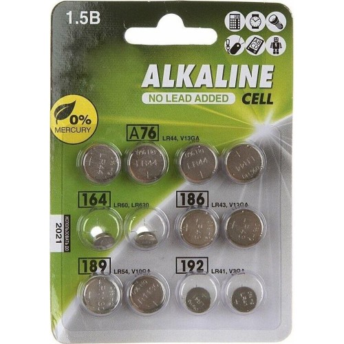 Комплект дисковых элементов питания GP включает в себя 12 марганцево-цинковых батареек различного диаметра и размера. Такие батарейки применяются в калькуляторах, часах, лазерных указках, секундомерах, мини-фонариках, кухонных весах, детских игрушках. Купив одну такую упаковку, вы сможете обеспечить энергией сразу несколько нужных приборов. Количество батареек в упаковке: 12 штук, из них: элементы питания LR44 (A76) – 4 шт; батарейки LR41 (192) – 2 шт; батарейки LR43 (186) – 2 шт; батарейки LR54 (189) – 2 шт; батарейки LR60 (164) – 2 шт. Разновидность батареек: Алкалин. Напряжение: 1,5 В. Температура хранения: до +30°С. Температура эксплуатации: от 0 до +45°С. Срок хранения: 3 года.