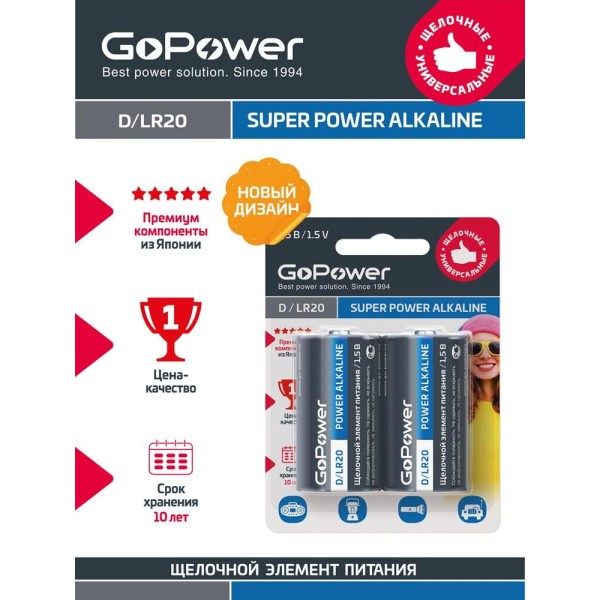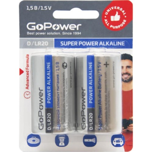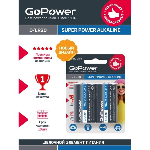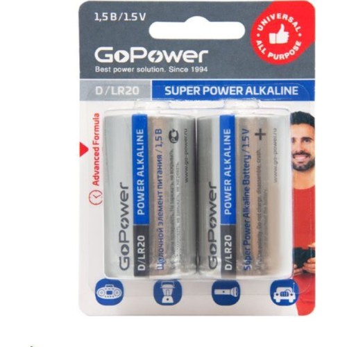 Элементы питания GOPOWER (00-00017862) LR20 D BL2 ALKALINE 1.5V