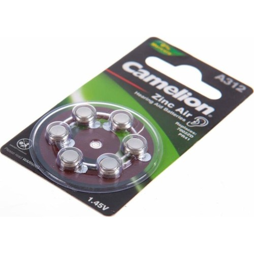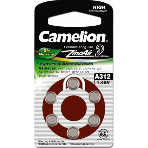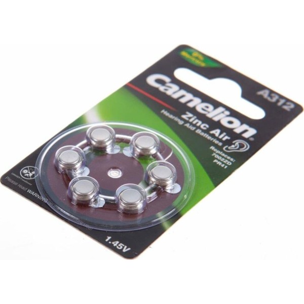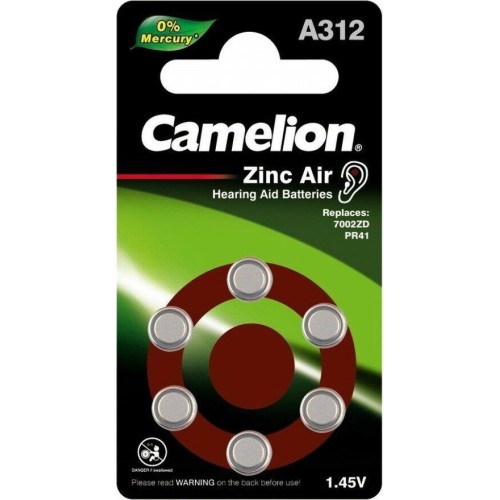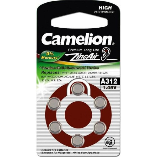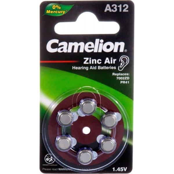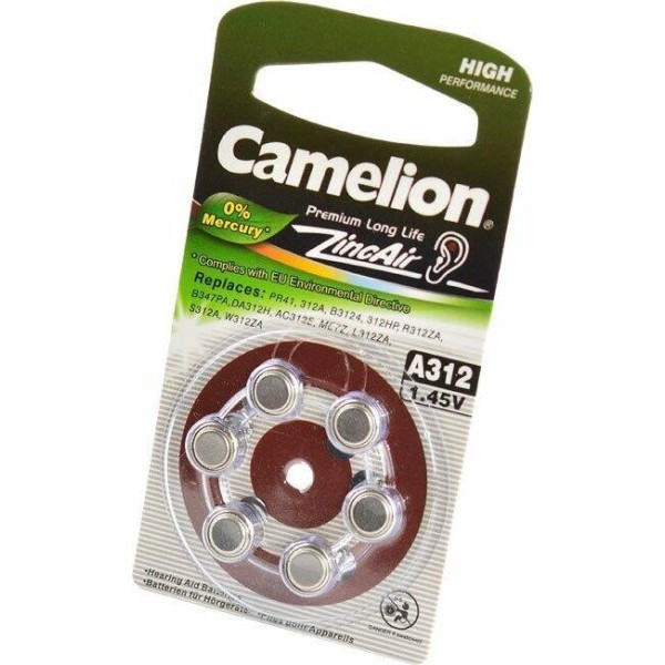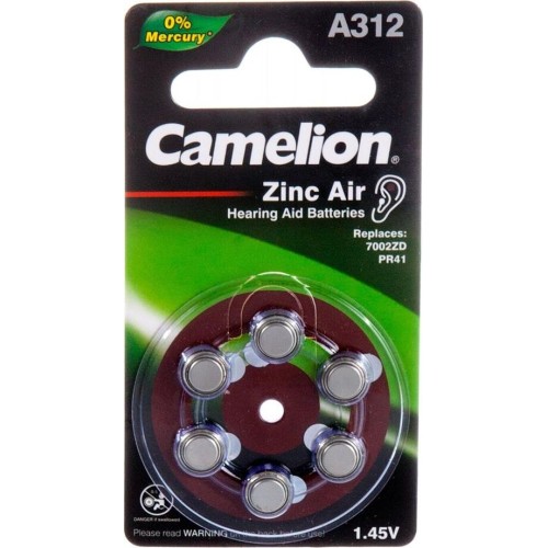 Батарейка Camelion ZA312 BL-6 Mercury Free (A312-BP6(0%Hg), батарейка для слуховых аппаратов, 1.4 V,170mAh), напряжение 1,4В, емкость 160мА*ч, кол-во в упаковке 6 шт., размер упаковки 40x90x4 мм, использовать при температуре от 0 до + 50 °C, хранить при температуре от +15 до +25 °C. Срок хранения 3 года.