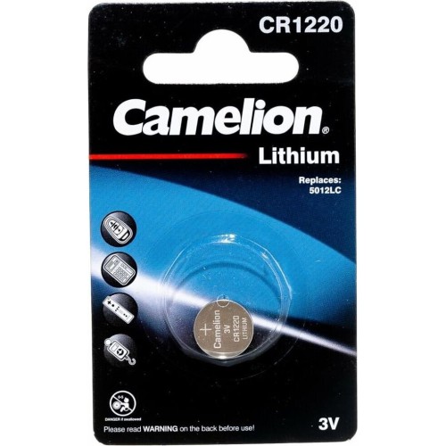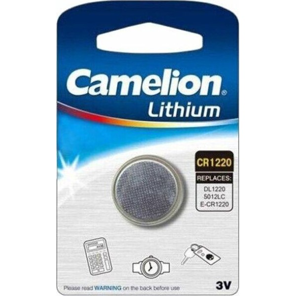 Батарейка литиевая Camelion CR1220-BP1B, напряжение 3В, емкость 38мА*ч, кол-во в упаковке 1 шт., размер упаковки 55x92x3 мм, использовать при температуре от - 20 до + 60 °C, хранить при температуре от +10 до +25 °C. Срок хранения 10 лет.