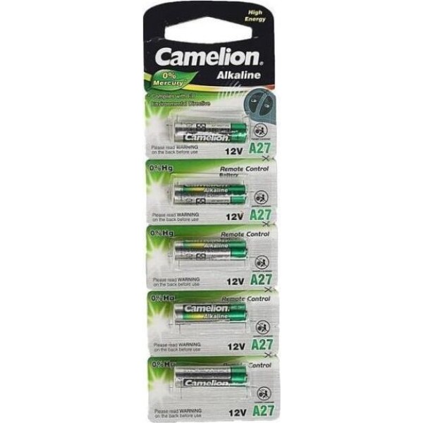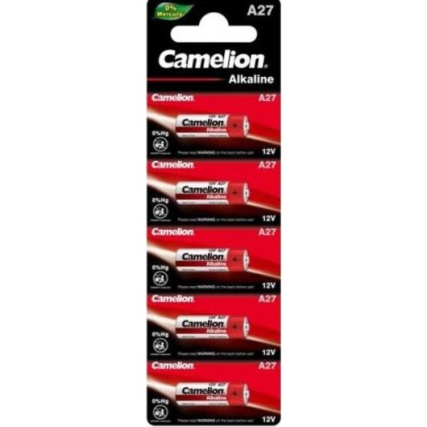 Батарейка алкалиновая Camelion LR27A BL-5 Mercury Free (A27-BP5, батарейка,12В), напряжение 12В, емкость 80мА*ч, кол-во в упаковке 5 шт., размер упаковки 50x160x10 мм, использовать при температуре от -18 до + 55 °C, хранить в сухом помещении при температуре от +15 до +25°C. Срок хранения 3 года.
