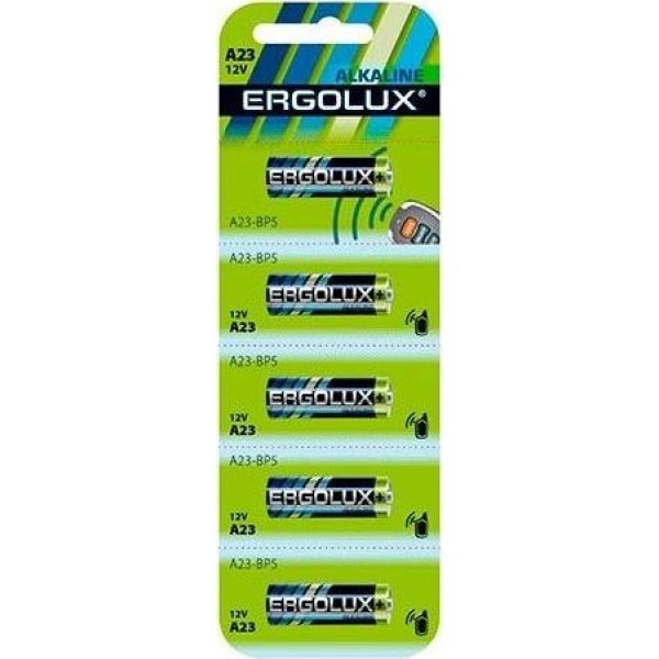 Батарейка алкалиновая Ergolux LR23A BL-5 (цилиндрическая – LR, 12В), напряжение 12В, емкость 55мА*ч, кол-во в упаковке 5 шт., размер упаковки 50x160x10 мм, использовать при температуре от + 10 до + 40 °C