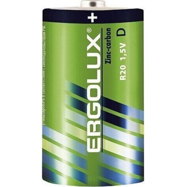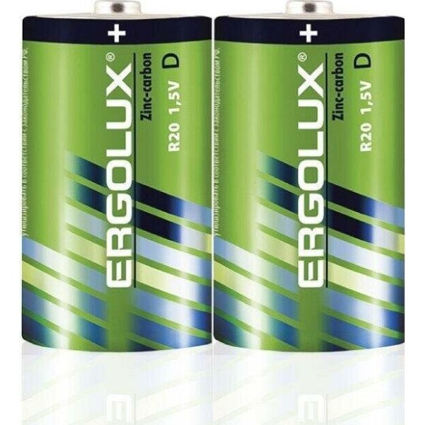 Батарейка Ergolux R20 SR2 (R20SR2), напряжение 1,5В, емкость 8050мА*ч, кол-во в упаковке 2 шт., размер упаковки 65x65x33 мм, использовать при температуре от -10 до + 40 °C