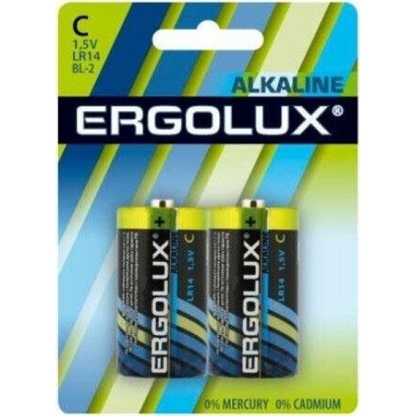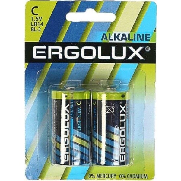 Батарейка Ergolux Alkaline BL-2 (C - LR14, 1.5В), напряжение 1,5В, емкость 8450мА*ч, кол-во в упаковке 2 шт., размер упаковки 84x114x11 мм, использовать при температуре от -10 до + 40 °C