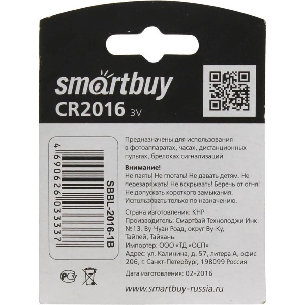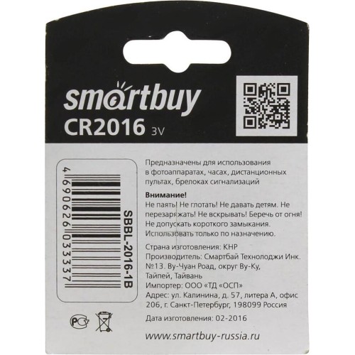 Батарейка SMARTBUY (SBBL-2016-1B) CR2016/1B