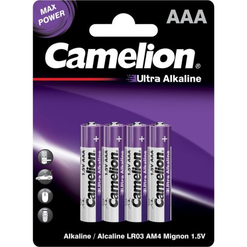 Улучшенные щелочные батарейки для устройств с высоким и импульсным энергопотреблением. Максимально широкий спектр применения. Батарейка Camelion LR03-BP4UT, напряжение 1,5В, емкость 1250 мА*ч, кол-во в упаковке 2 шт., размер упаковки 84x114x11 мм,использовать при температуре от -18 до + 55 °C, хранить в сухом помещении при температуре от +15 до +25°C. Срок хранения 10 лет. Улучшенные щелочные батарейки. Проявляют повышенную работоспобность в устройствах с импульсным энергопотреблением.